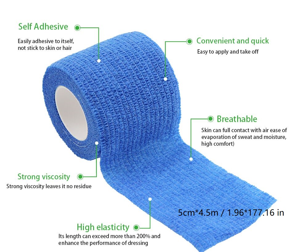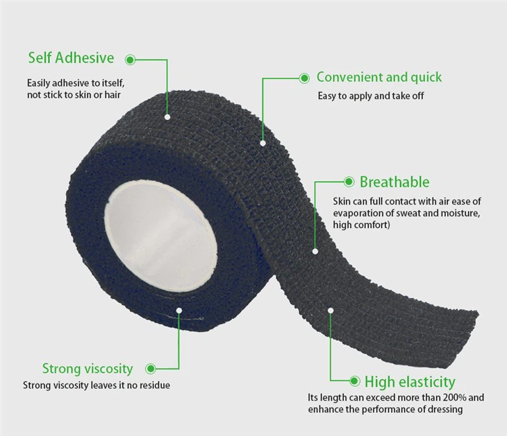 خود چپکنے والی پٹی کی لپیٹ میڈیکل گریڈ غیر بنے ہوئے یا روئی ، اسپینڈیکس ، میڈیکل ہائپواللجینک چپکنے والی سے بنا ہے۔ اس بات کو یقینی بناتا ہے کہ آپ کی جلد نرم اور آرام دہ محسوس ہوتی ہے ، اور مضبوط اور عمدہ مدد فراہم کرتی ہے۔ دوسرے خود چپکنے والے ٹیپوں کے برعکس ، میڈیکل ٹیپ کو اعلی درجہ حرارت پر جراثیم سے پاک کیا گیا ہے ، جس سے اسے استعمال کرنا زیادہ محفوظ ہوجاتا ہے۔